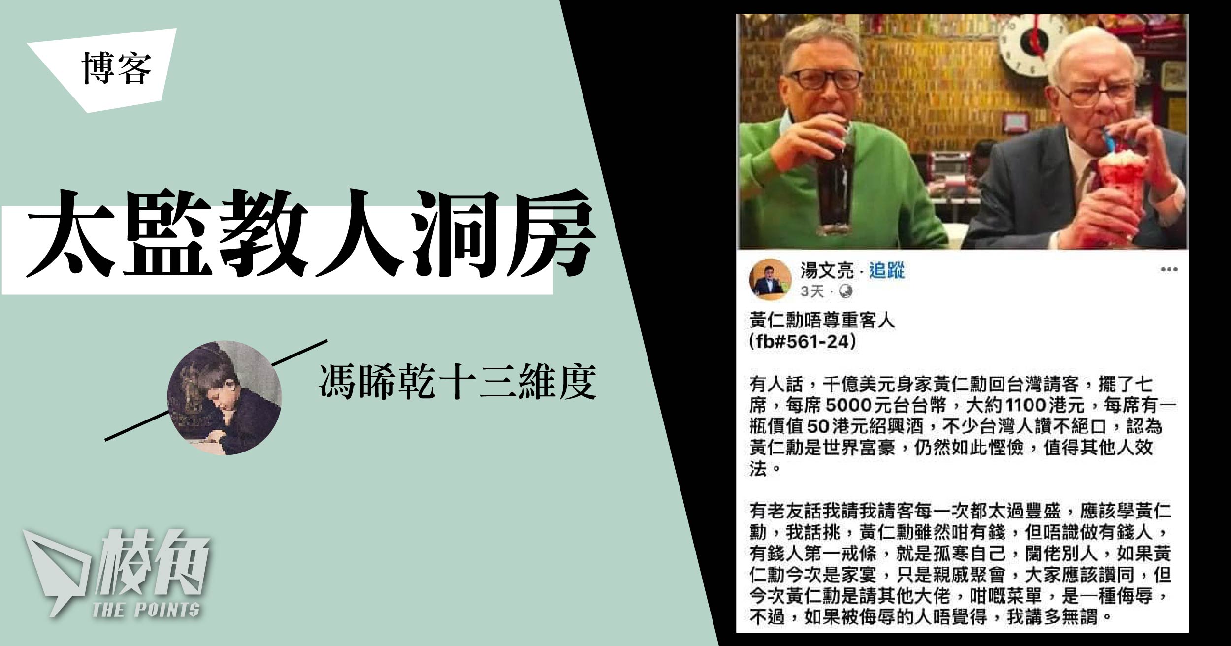 選擇到哪裏吃飯,一餐飯吃多少錢,是人家的自由,想不到香港有個所謂「作家」湯文亮,居然在社交媒體和報紙專欄大放厥詞,批評黃仁勳宴客太寒酸,「唔尊重客人」(粵語「唔」即是「不」)、「唔識做有錢人」云云(見附圖)。看到這種無知狂妄的評論,不禁駭笑。