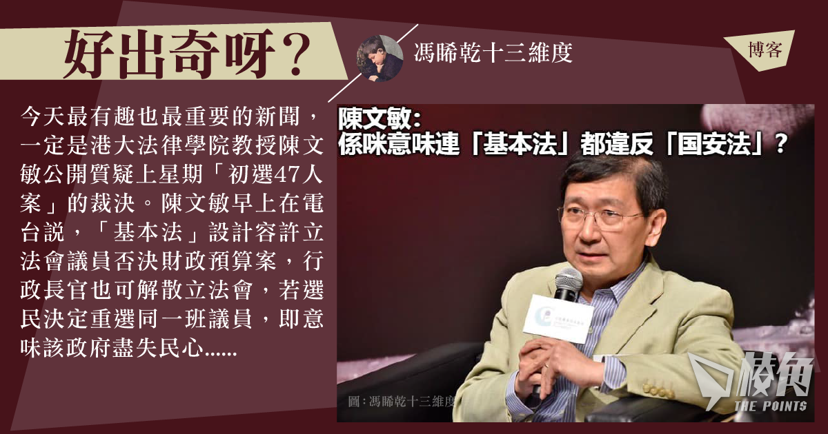 今天最有趣也最重要的新聞,一定是港大法律學院教授陳文敏公開質疑上星期「初選47人案」的裁決。陳文敏早上在電台說,「基本法」設計容許立法會議員否決財政預算案,行政長官也可解散立法會,若選民決定重選同一班議員,即意味該政府盡失民心。