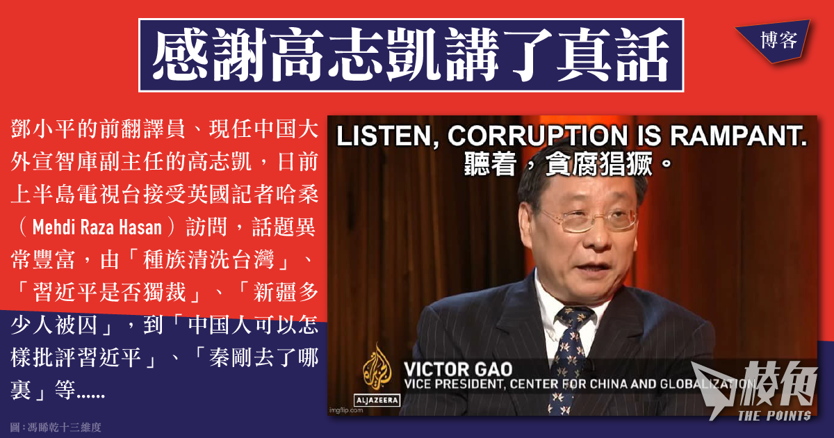 鄧小平的前翻譯員、現任中国大外宣智庫副主任的高志凱,日前上半島電視台接受英國記者哈桑(Mehdi Raza Hasan)訪問,話題異常豐富,由「種族清洗台灣」、「習近平是否獨裁」、「新疆多少人被囚」,到「中国人可以怎樣批評習近平」、「秦剛去了哪裏」等。
