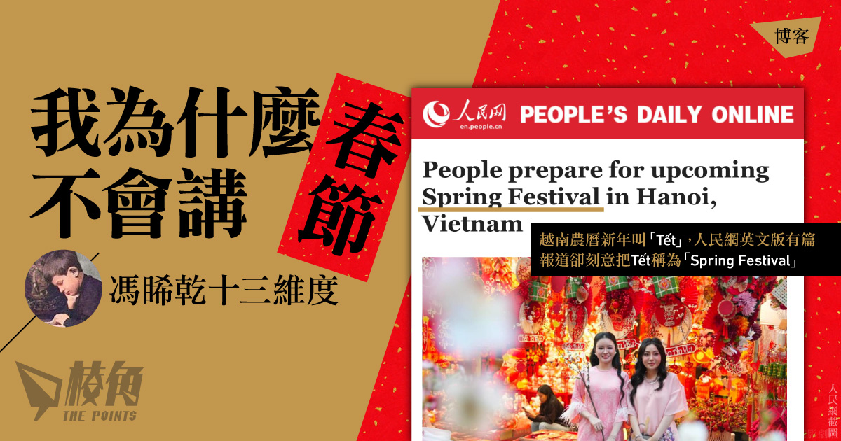 其次,韓國、越南、馬來西亞等地也過農曆新年,中国「申遺」後,就可以用「Spring Festival」來「統一」各國農曆新年的稱呼,宣示自己的文化霸權。如越南農曆新年叫「Tết」,英文本可簡單譯成「Lunar New Year」,但人民網英文版在1月23日有篇報道〈People prepare for upcoming Spring Festival in Hanoi, Vietnam〉,卻刻意把Tết稱為「Spring Festival」,司馬昭之心,路人皆知。
