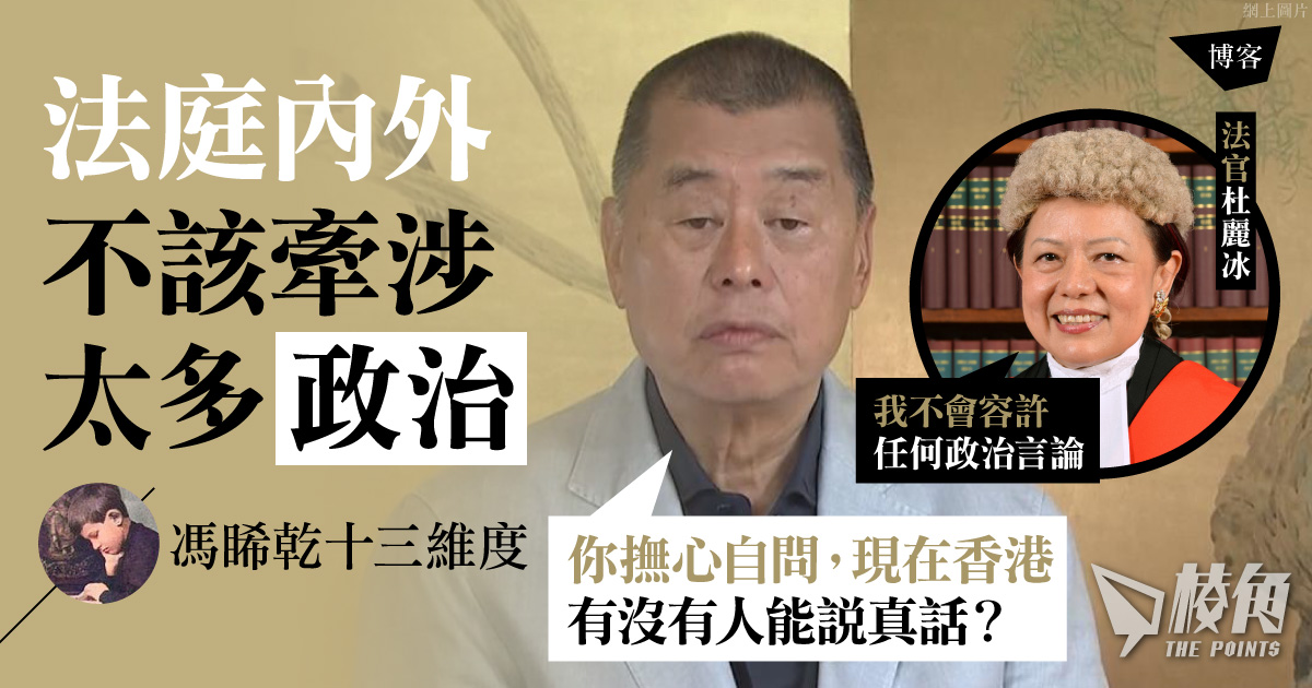 聽見這種比喻,我也想問杜麗冰有何「根據」——中華民國今年114歲,中共国才76歲,若非「政治言論」,怎會把台灣比喻為中国的孩子呢?也許,今天香港所謂「政治言論」只是一個委婉語,說穿了,不過代表一切「不利於中共的論述」。至此,我終於真正明白2018年容海恩金句「議會內外都不應該牽涉太多政治」是什麼意思了。
