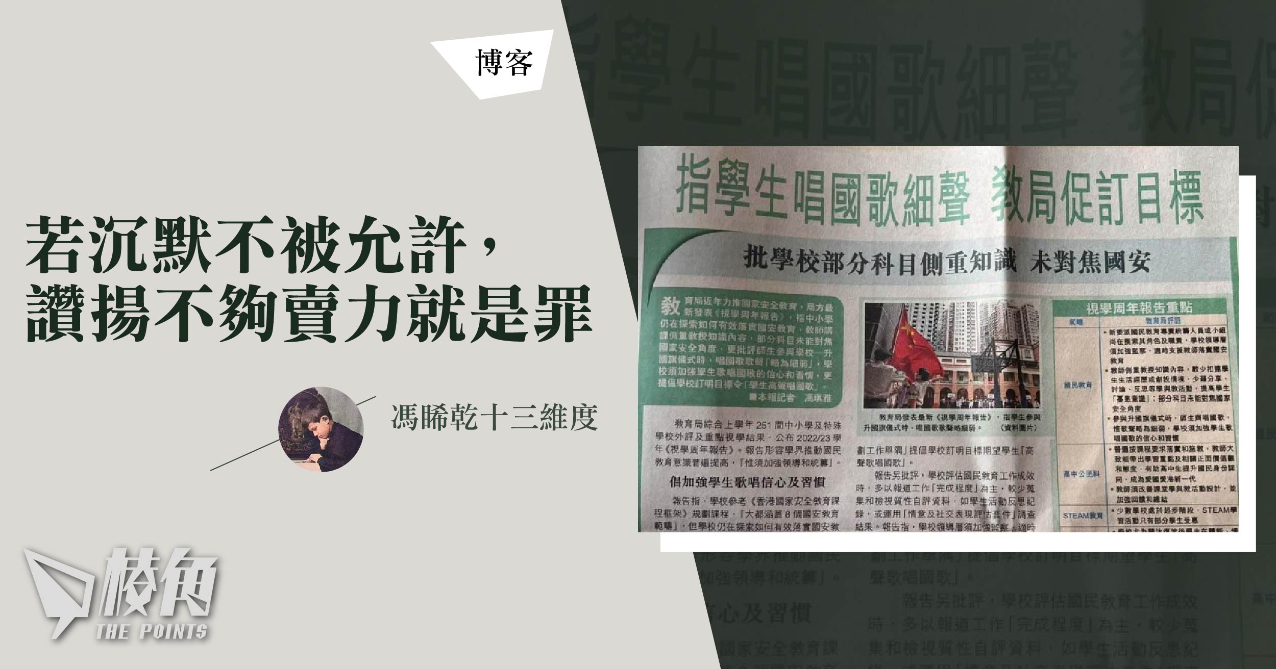 如今一晃眼,「反国教」已過十年,香港滄海桑田,當年的學生領袖也被關在獄中。香港「教育」在不知不覺間,原來已走到「唱国歌不夠大聲將是一種罪行」的階段,下一步會不會是「撒謊不夠賣力便要遭受權力的懲罰」?
