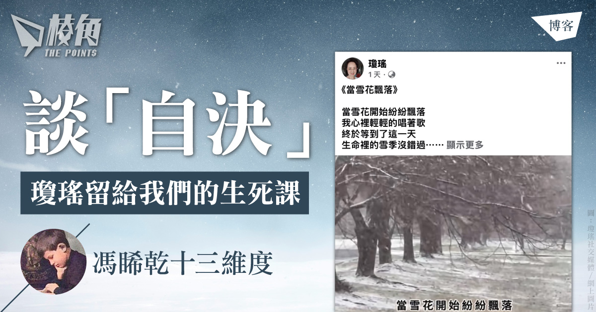 瓊瑤之死,有人覺得已深思熟慮,不該稱為「輕生」,以示尊重。那叫什麼好呢?有人呼為「自主死亡」。我反而想到一個詞:自決。不是開玩笑,「自決」在古文原本解「自殺」,現在兼有「自己作決定」意思,一語雙關,正可用來形容瓊瑤的抉擇。