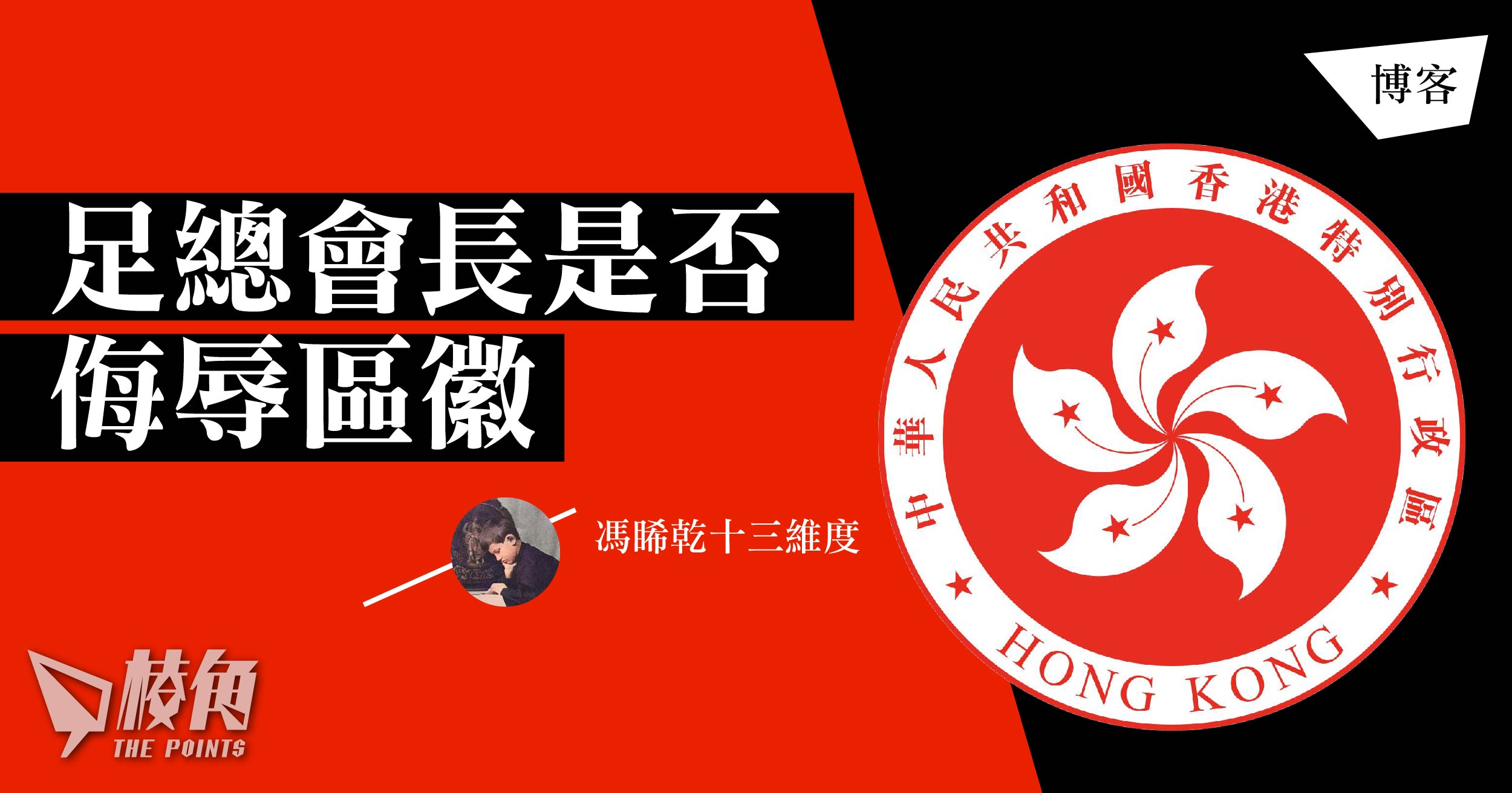 論「正式官式」,區徽區旗應該是這方面的極致吧?但深入民心的香港區徽,英文也只寫「Hong Kong」,沒有完整寫出「Hong Kong, China」,按照足總會長的邏輯,區徽是「錯」足27年。我不禁懷疑他是否抹黑「基本法」規定的香港區徽設計,從而引起市民對「基本法」的憎恨和叛離。