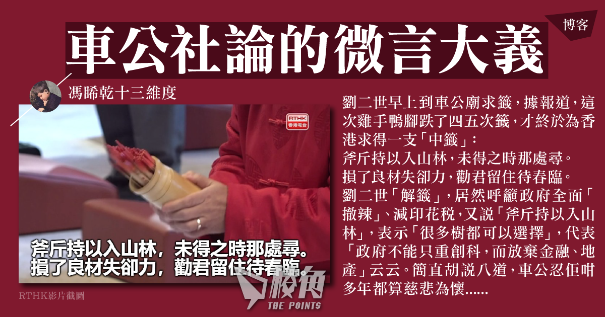 很多人都看得出,車公是苦口婆心勸大家繼續「躺平」,勿白費氣力,這固然是一個合理解法,但我認為整支籤還有一個重點,就是預言香港在不對的時候,做不對的事。