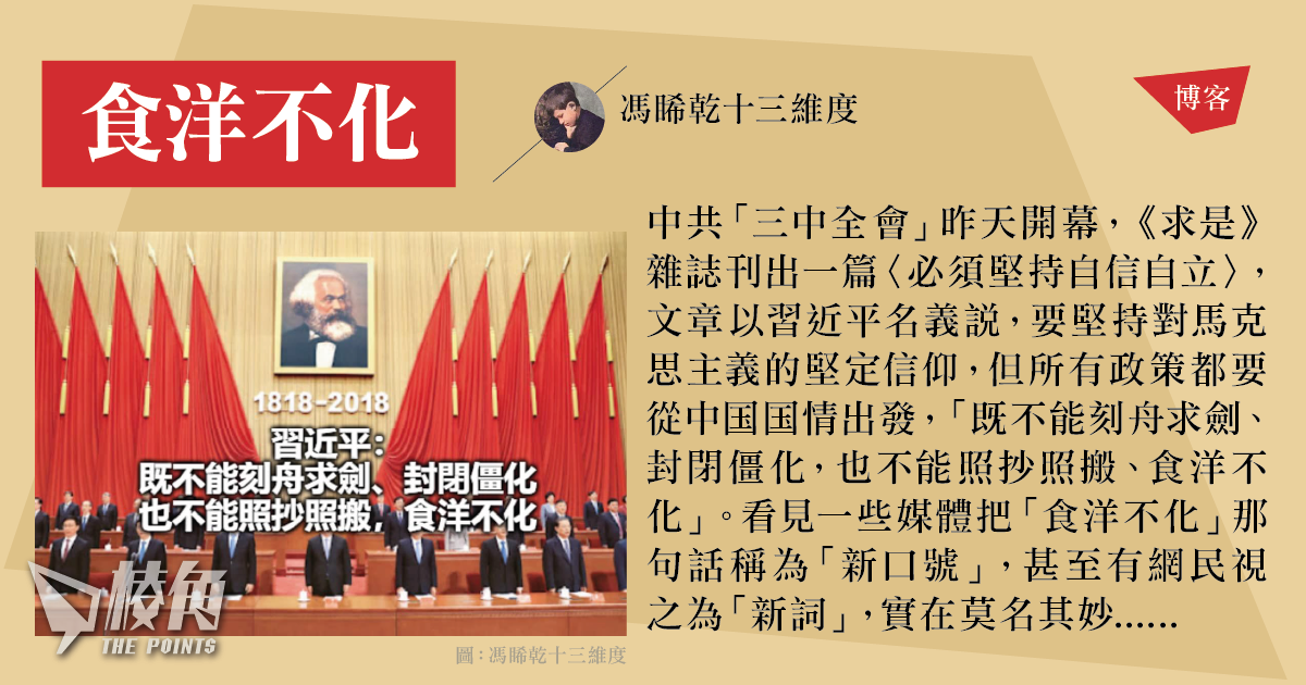 中共「三中全會」昨天開幕,《求是》雜誌刊出一篇〈必須堅持自信自立〉,文章以習近平名義說,要堅持對馬克思主義的堅定信仰,但所有政策都要從中国国情出發,「既不能刻舟求劍、封閉僵化,也不能照抄照搬、食洋不化」。看見一些媒體把「食洋不化」那句話稱為「新口號」,甚至有網民視之為「新詞」,實在莫名其妙。