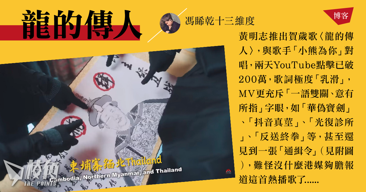黃明志推出賀歲歌〈龍的傳人〉,與歌手「小熊為你」對唱,兩天YouTube點擊已破200萬,歌詞極度「乳滑」,MV更充斥「一語雙關、意有所指」字眼,如「華偽寶劍」、「抖音真莖」、「光復診所」、「反送終拳」等,甚至還見到一張「通緝令」(見附圖),難怪沒什麼港媒夠膽報道這首熱播歌了。