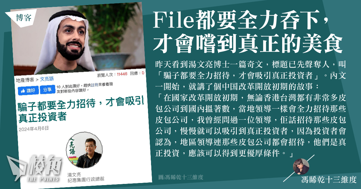 如果湯博士真的相信自己的「千金市骨」理論,我覺得就應該身體力行,起碼先找數吞了他幾年前承諾要吞落肚的file再說,因為按照他的邏輯,「file都要全力吞下,才會嚐到真正的美食」,對不對?