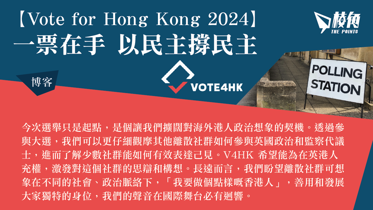 隨著2024年英國大選進行在即,Vote for Hong Kong 2024(V4HK)旨在動員在英國擁有投票資格的香港人,在塑造與倡議英國政治及國際議題上發揮最大的影響力。