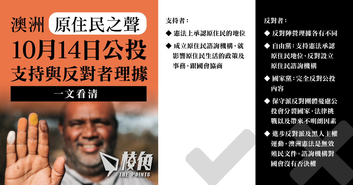 澳洲總理阿爾巴尼斯(Anthony Albanese)日前宣佈「原住民議會之聲」(Indigenous Voice to Parliament),將於10月14日舉行全民公投。這是澳洲24年來的首次全民公投,凡年滿18歲的澳洲登記選民均必須投票。澳洲民眾對「原住民之聲」意見分歧,支持及反對民意拉鋸。