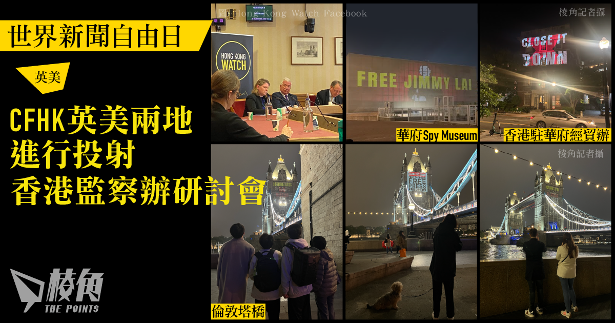 香港自由基金會委員會(CFHK)在周四(5月2日)晚上,在倫敦及華府兩地進行投射行動。在倫敦塔橋的投射行動展示了世界各地被囚禁的記者,包括黎智英、黃雪琴、董郁玉、格什科維奇(Evan Gershkovich)等,吸引到泰晤士河兩岸的途人停下來觀看和拍照。而在華府,除了在間諜博物館(Spy Museum)外的建築物牆上投射,更首次針對政治建築物,在香港駐華府經貿辦牆上投射,呼籲關注《香港經貿辦認證法案》及建議將華府經貿辦前的馬路命名為「黎智英路」的法案。