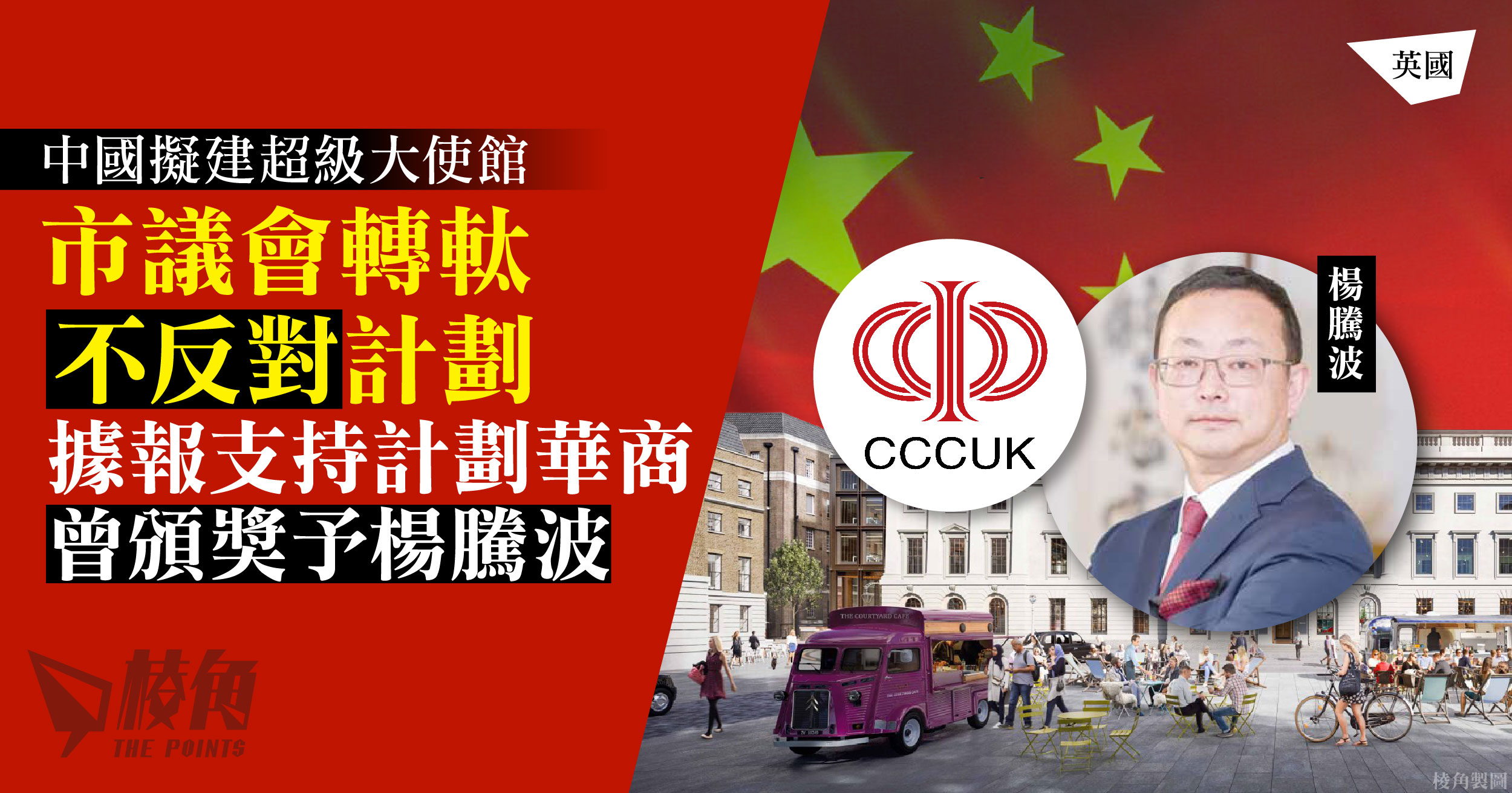 中國擬於倫敦改建超級大使館,周二(11日)舉行聽證會。項目規劃檢察專員施雅臣(Claire Searson)在會上表示,超級大使館選址塔村市議會(Tower Hamlets Council)已提交修訂聲明,表明不會就反對計劃提供理據,有別於去年曾一致否決計劃的強硬立場。計劃書中列舉多個支持改建方案的組織,據報其中「英國中國商會」(China Chamber of Commerce in the UK,下稱英中商會)與英國安德魯王子關係密切,該商會亦曾頒獎予早前被控為中國間諜的商人楊騰波(Yang Tengbo)。