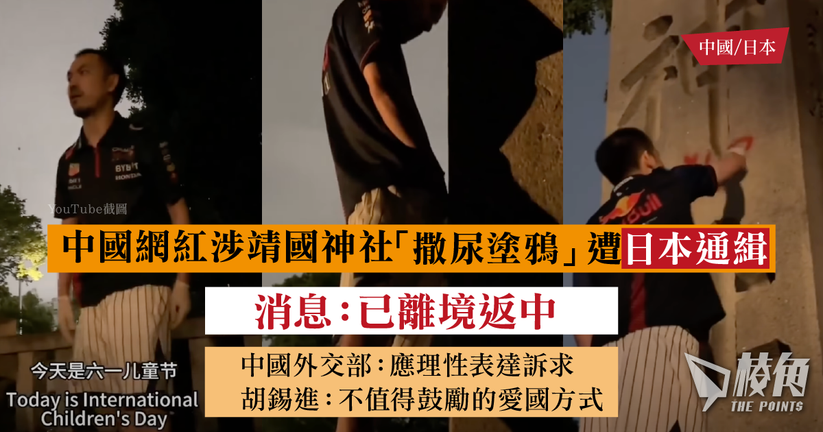 日本靖國神社一根刻有「靖國神社」的石柱日前遭人撒尿、塗鴉,日本警方正以毀損器物偵辦。消息指,涉案男子為一名中國網紅,上周六(6月1日)已返回中國。