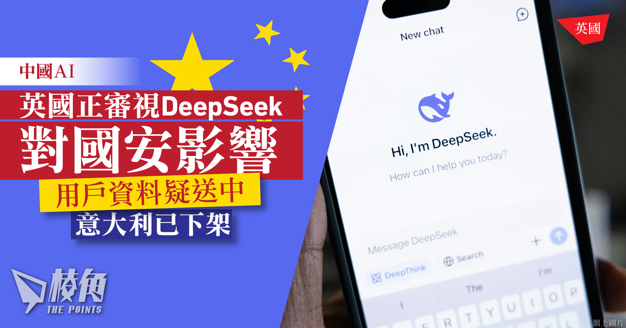 中國AI|英國正審視DeepSeek對國安影響 用戶資料疑送中意大利已下架
