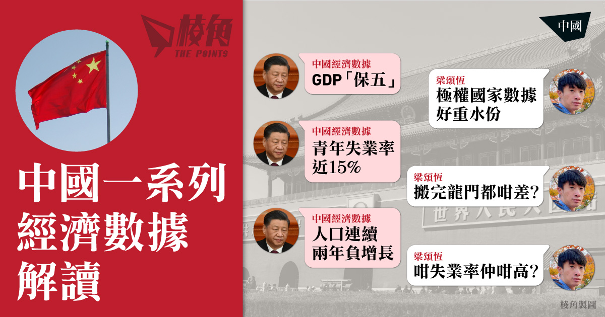 中國公布一系列經濟數據,包括去年國內生產總值(GDP)按年增長5.2%,中國國家統計局聲稱交出一份成色好、分量足的成績單。而去年中國城鎮調查失業率平均值5.2%,單計去年12月則為5.1%,期內,不包含在校生的16至24歲青年失業率高達14.9%,而25至29歲及30至59歲的失業率分別是6.1%及3.9%。另外,去年中國人口連續第二年出現負增長,按年減少208萬人,截至去年底,中國人口為14.0967億人。
