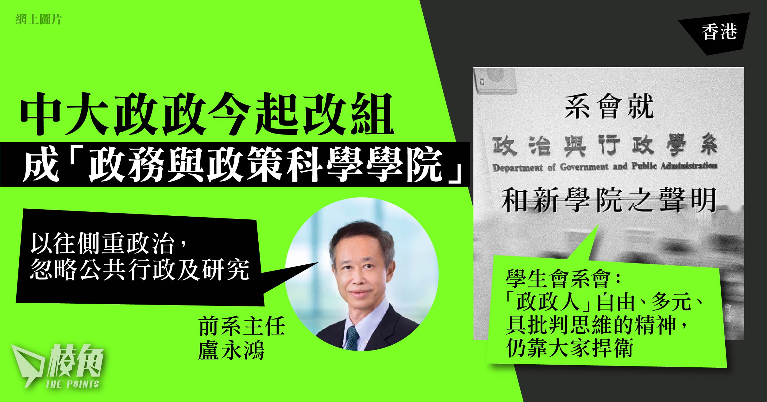 香港中文大學「政治與行政學系」(下稱政政系)於周四(1日)起,與其他學系改組為「政務與政策科學學院」(下稱新學院),「政治」一詞被刪惹關注。原政政系主任盧永鴻表示,學系以往側重政治,忽略公共行政及研究發展。學生會系會在正式改組前一天發文表示,對改組感到前所未有的動盪和不穩,重申「政政人」自由、多元、具批判思維的精神,仍靠大家捍衛。