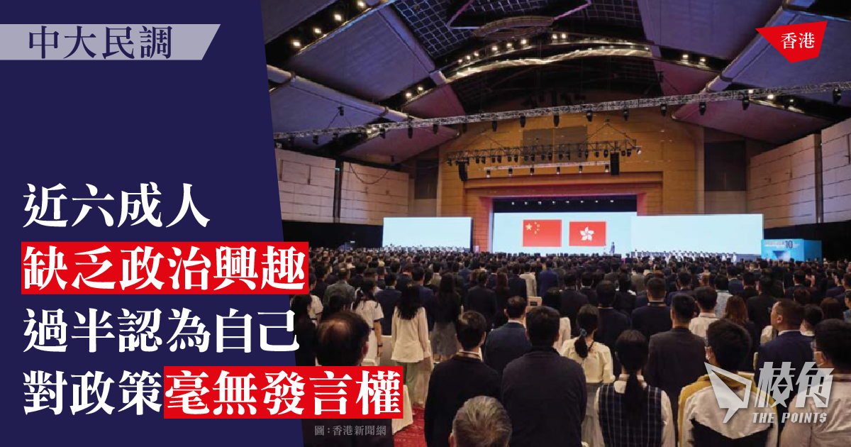 香港中文大學香港亞太研究所周一(9日)發表調查報告,近6成受訪市民表示對政治「沒甚麼興趣」及「完全沒有興趣」,比例較去年微跌約4%;分別有超過一半受訪者認為「政府官員不太在乎我這類人的想法」及「像我這類人對政府的政策並無任何發言權」,比例均較去年上升。