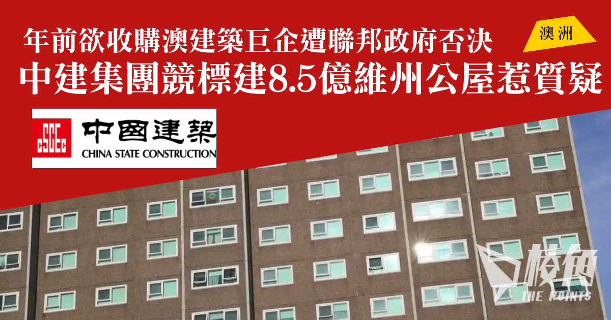 據《先驅太陽報》報導,屬中國國企的中國建築集團(CSCE)與兩家澳洲公司Capella Capital、Hickory合作,出價競投維州公屋建築項目,價值達8.5億元。中建曾於年前計劃收購澳洲破產的建築公司ProBuild,遭上任政府財長以國安理由否決,有行內人士認為維州住屋管理局及聯邦政府,應對今次競標的公司進行盡職審查,並評估各項潛在風險。