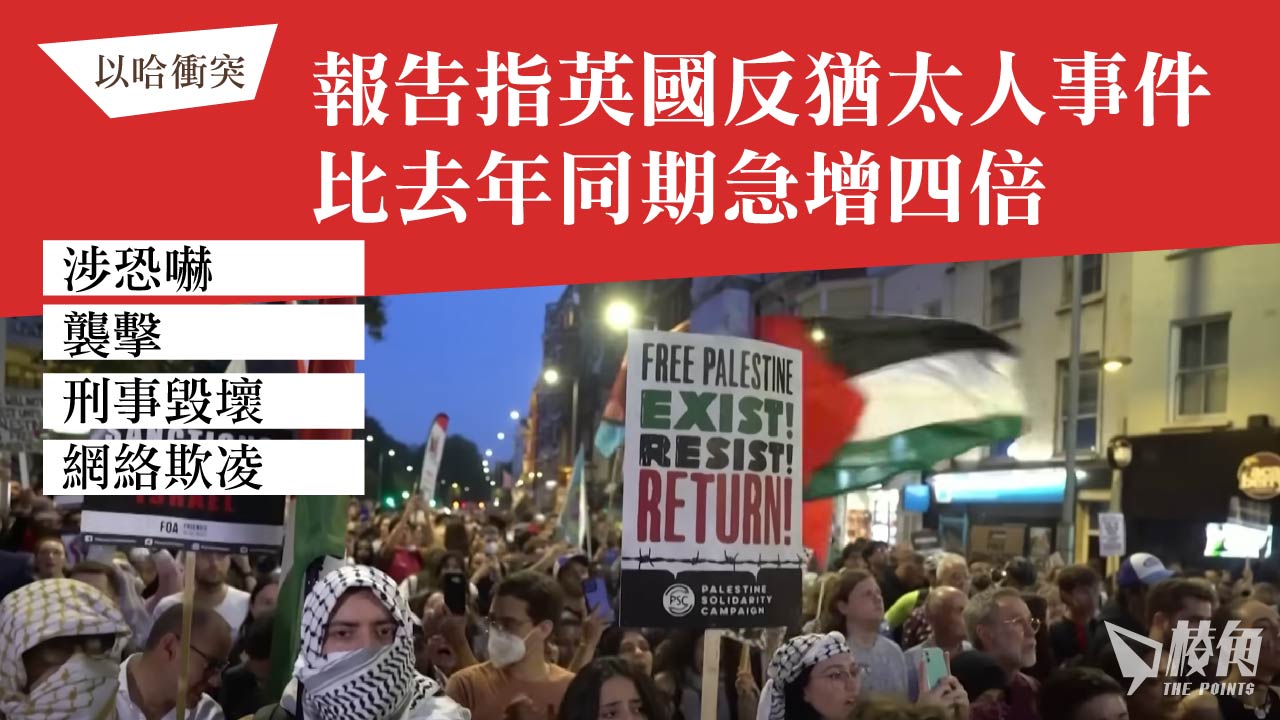 以色列及巴勒斯坦組織哈馬斯爆發激烈衝突後,英國猶太慈善機構公布數據指,單由10月7日至10日,共接獲89宗有關反猶太主義事件,比去年同期急增4倍,事件涉死亡恐嚇、襲擊、刑事毁壞及網絡欺凌等,情況值得關注。