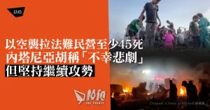 - 以軍於周日晚空襲加沙走廊南部城市拉法的一處難民營地,並引發營區大火,造成至少45人死亡、200多人受傷
