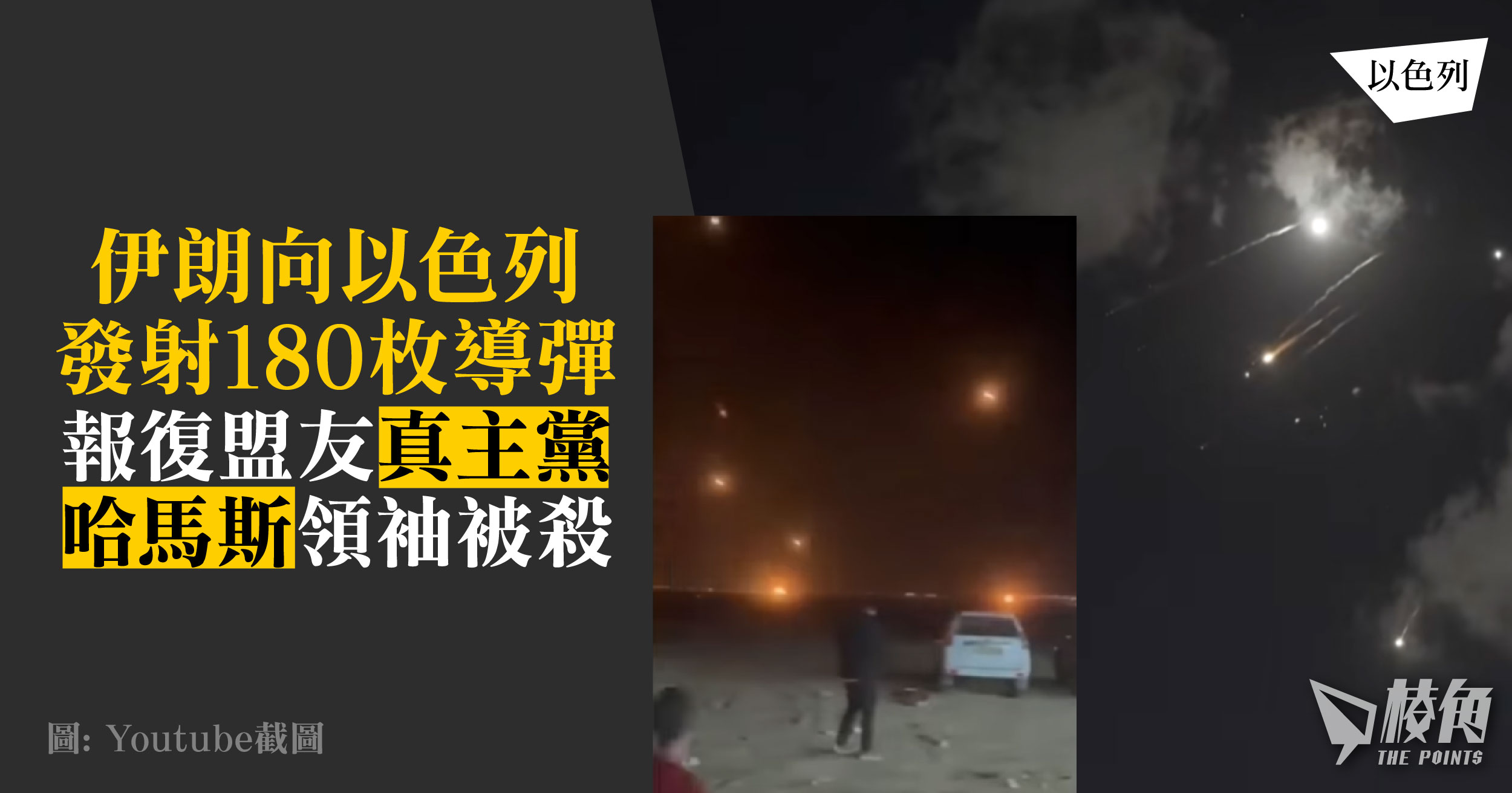 中東緊張局勢持續升級,伊朗於當地時間周二(1日)向以色列發射了180枚導彈,部分導彈在美軍協助下被攔截,最少造成7人死亡及16人受傷。有特拉維夫民眾上載影片,可見導彈密集程度在夜空中猶如流星雨,落地後出現火光。伊朗革命衛隊表示,今次攻擊是為報復盟友真主黨、哈馬斯多位領袖被殺。以色列總理內塔尼亞胡(Benjamin Netanyahu)表示,伊朗犯下了重大錯誤,更揚言會報復。