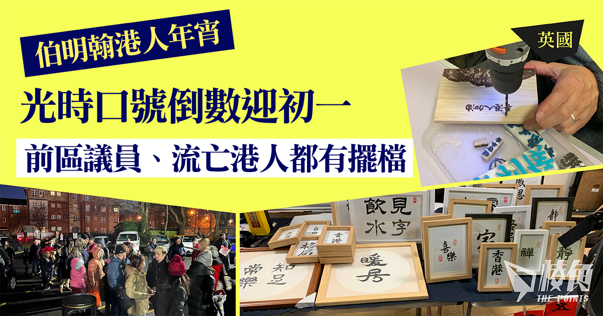 農曆新年英國各地都有不同組織舉辦港人年宵市集,周末(1月20至21日)伯明翰的「榮光年宵」有二、三千人參加,香港的前區議員、獲得英國政治庇護的流亡港人等都有擺檔。在年三十晚,市集人群更用「光時」口號迎接大年初一。