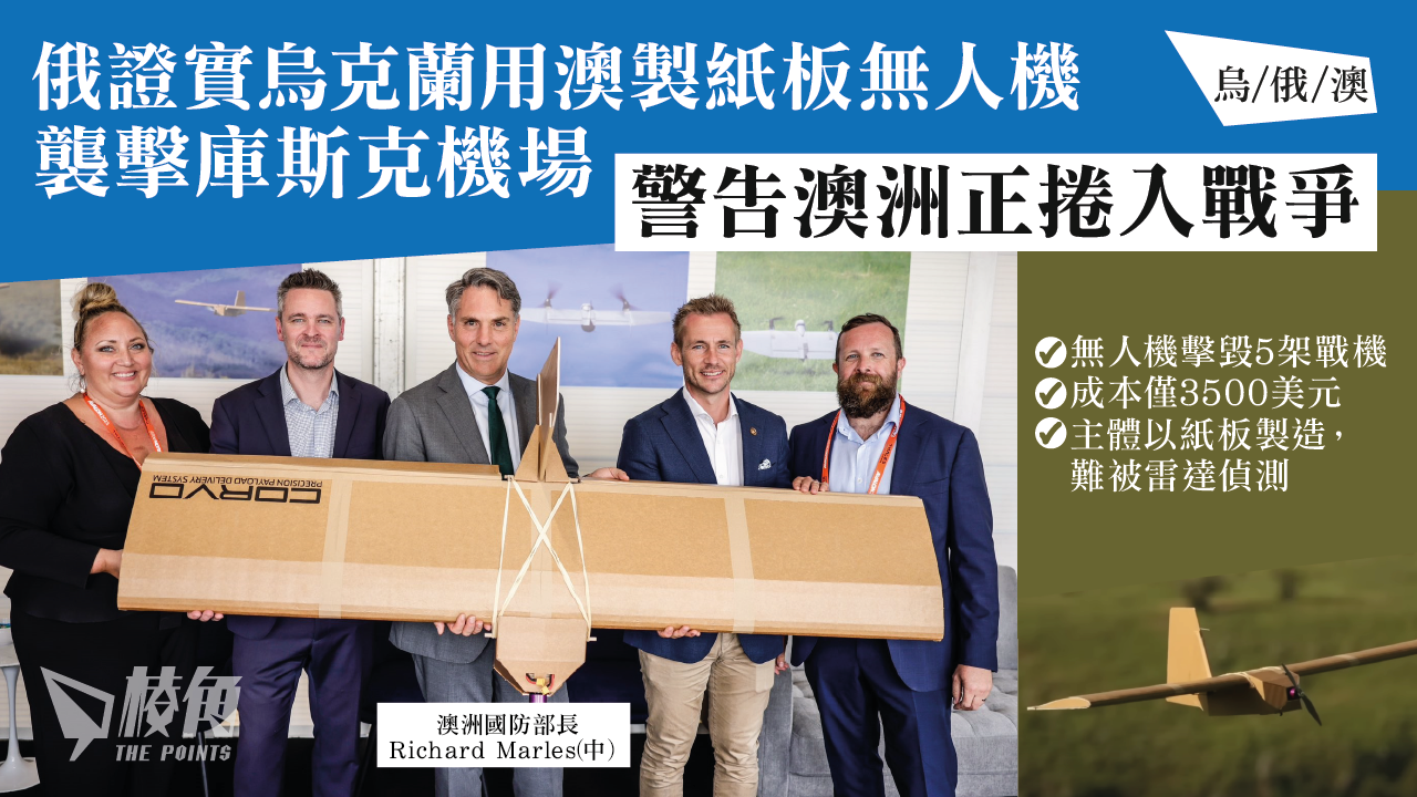 上周有報導指出,烏克蘭使用澳洲製造的紙板無人機進行自殺式襲擊,針對俄羅斯邊境城市庫斯克(Kursk)的機場,擊毀了5架俄國軍機。俄國外交部發言人Maria Zakharova證實了這一消息,並警告澳洲正在被捲入這場戰爭,同時指出澳洲政府試圖向公眾隱瞞此事。