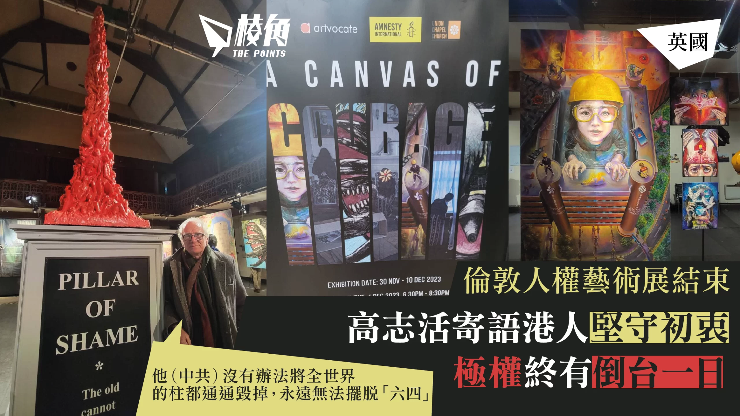 國際特赦組織英國分部(Amnesty International UK)及藝術平台「Artvocate」在倫敦合辦《A Canvas of Courage》人權藝術展,於周日「國際人權日」閉幕。製作《國殤之柱》的丹麥藝術家高志活(Jens Galschiøt)接受訪問時表示,希望港人堅守初衷,極權終有倒台的一日。
