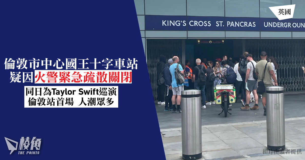 倫敦市中心國王十字車站,於當地時間周四(15日)約下午3:45,疑因火警需緊急關閉,站內職員疏散大批乘客。國王十字車站連接火車站,有讀者向《棱角》表示,被疏散乘客部分攜行李箱,職員未當時未有交待原因。同日晚,歌手Taylor Swift於溫布萊將舉行巡迴演唱會,國王十字車站為其中一個重要轉車站,人流眾多。