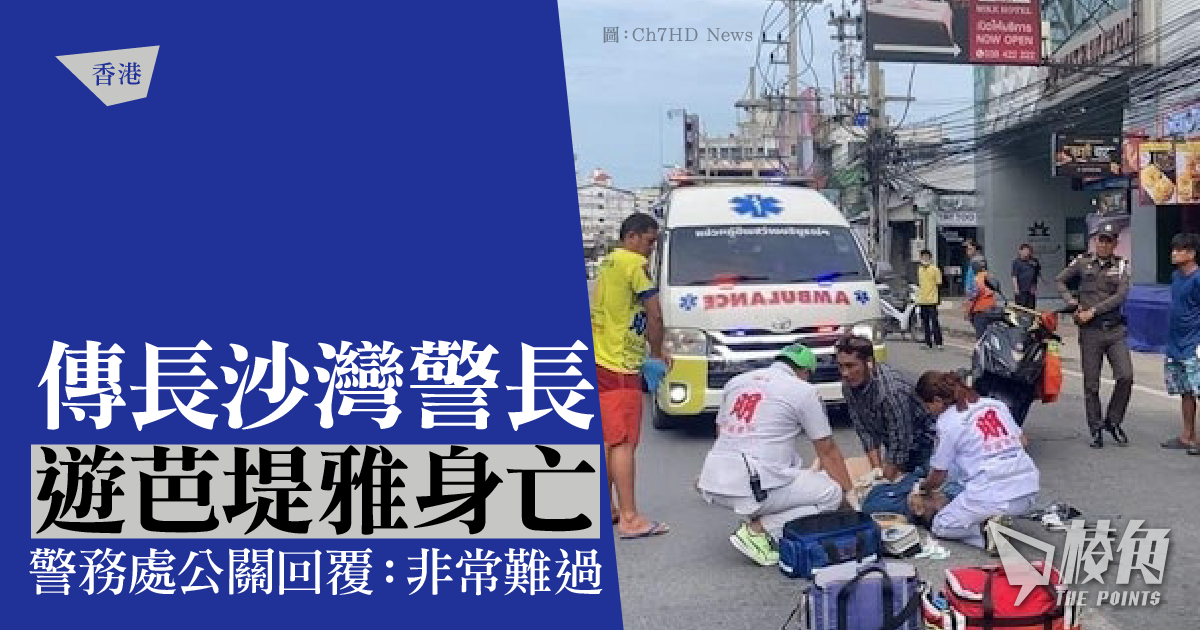 泰國傳媒報道,一名48歲中國籍男子周一(7月22日)早上8時半左右,在泰國芭提雅從一輛雙排車上跌出馬路死亡。消息指,死者為一名警長,駐守長沙灣分區。《棱角》以電郵向香港警務處公共關係部查詢,了解警方有否跟進確認死者身分,及如何支援家屬。當值新聞主任回覆稱「警方對一名警務人員在外地離世感到非常難過,已向相關人員的家人表示深切慰問,並會與他們保持緊密聯絡,提供一切適切的協助」。