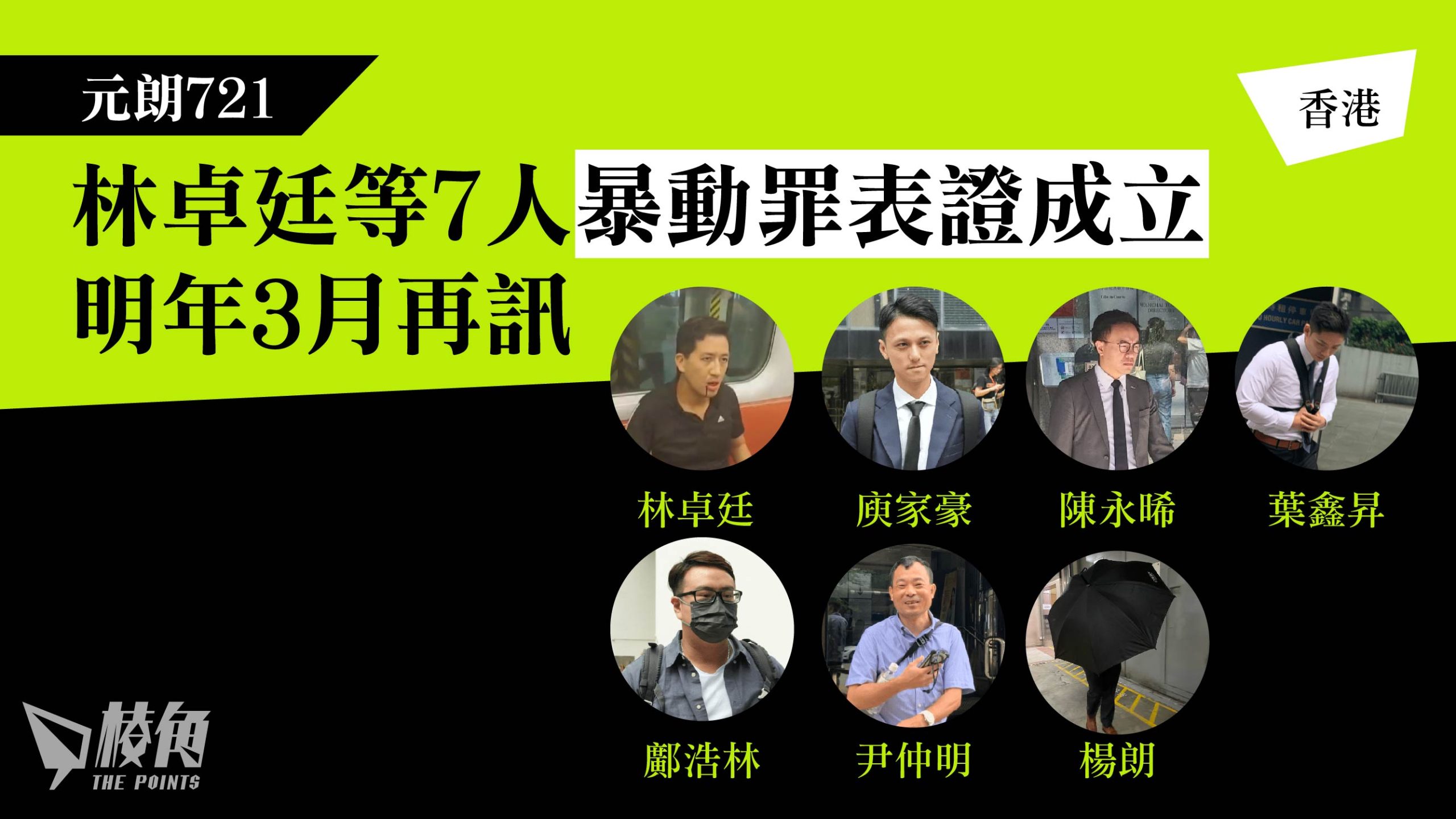 元朗「721」白衣人無差別事件中,遭白衣人襲擊的民主黨前立法會議員林卓廷,與6男被控暴動罪。案件審訊第22日,法官陳廣池裁定7名被告暴動罪表面證供成立,全部被告需要答辯,案件押後至明年3月5日再訊。