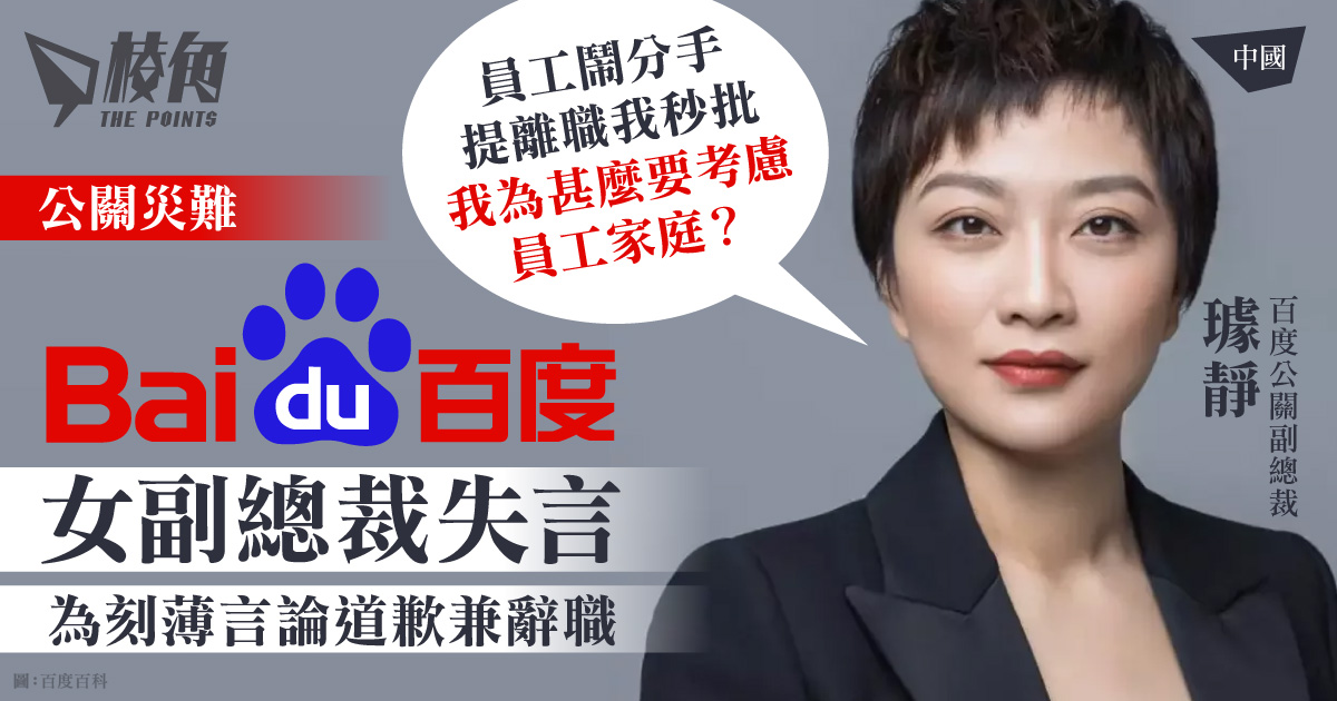 - 巨頭公關副總裁璩靜,因發布言論刻薄的抖音影片而道歉並離職