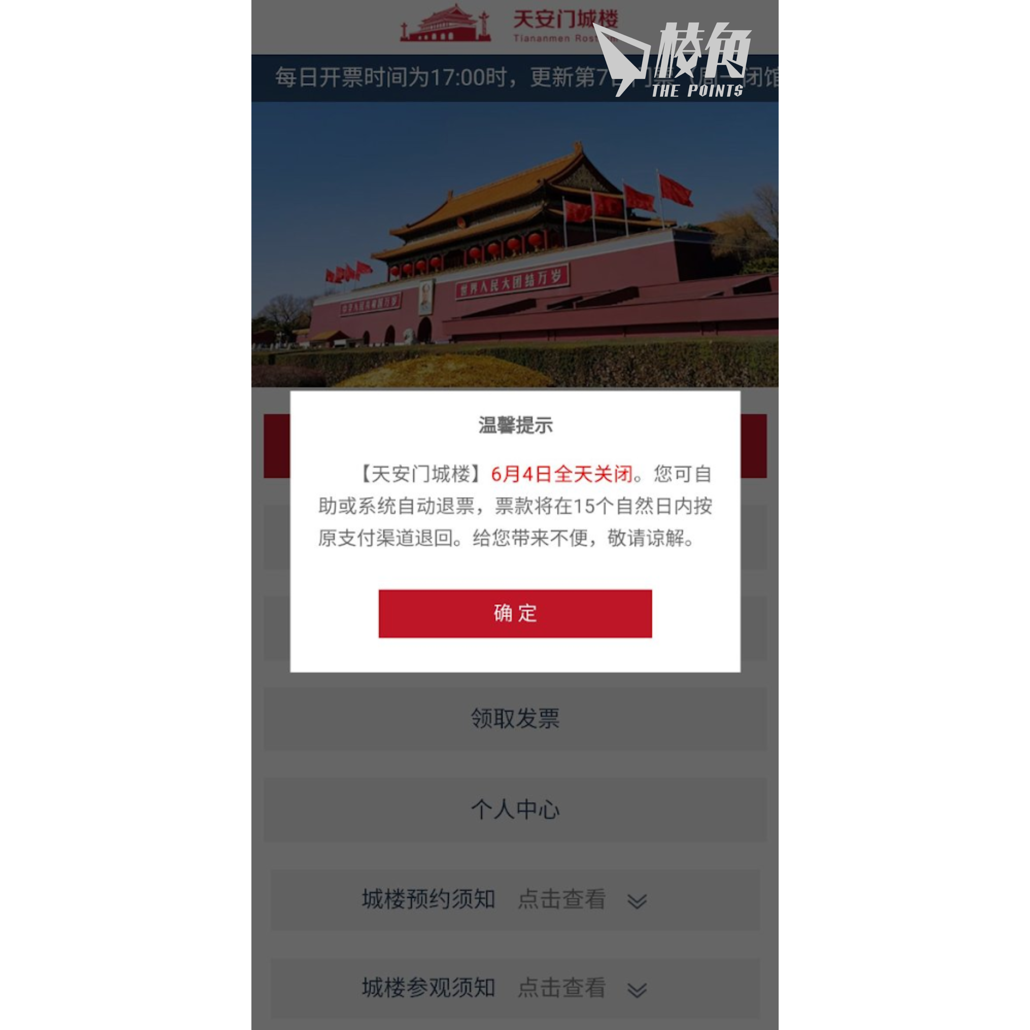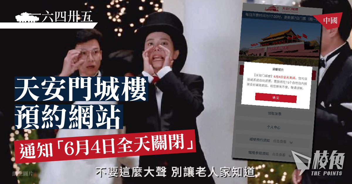 「六四事件」35週年前夕,有中國網民發現,天安門城樓預約網站主頁面出現「溫馨提示」。官方指「天安門城樓6月4日全天關閉」,並指示已購票人士申請退款。