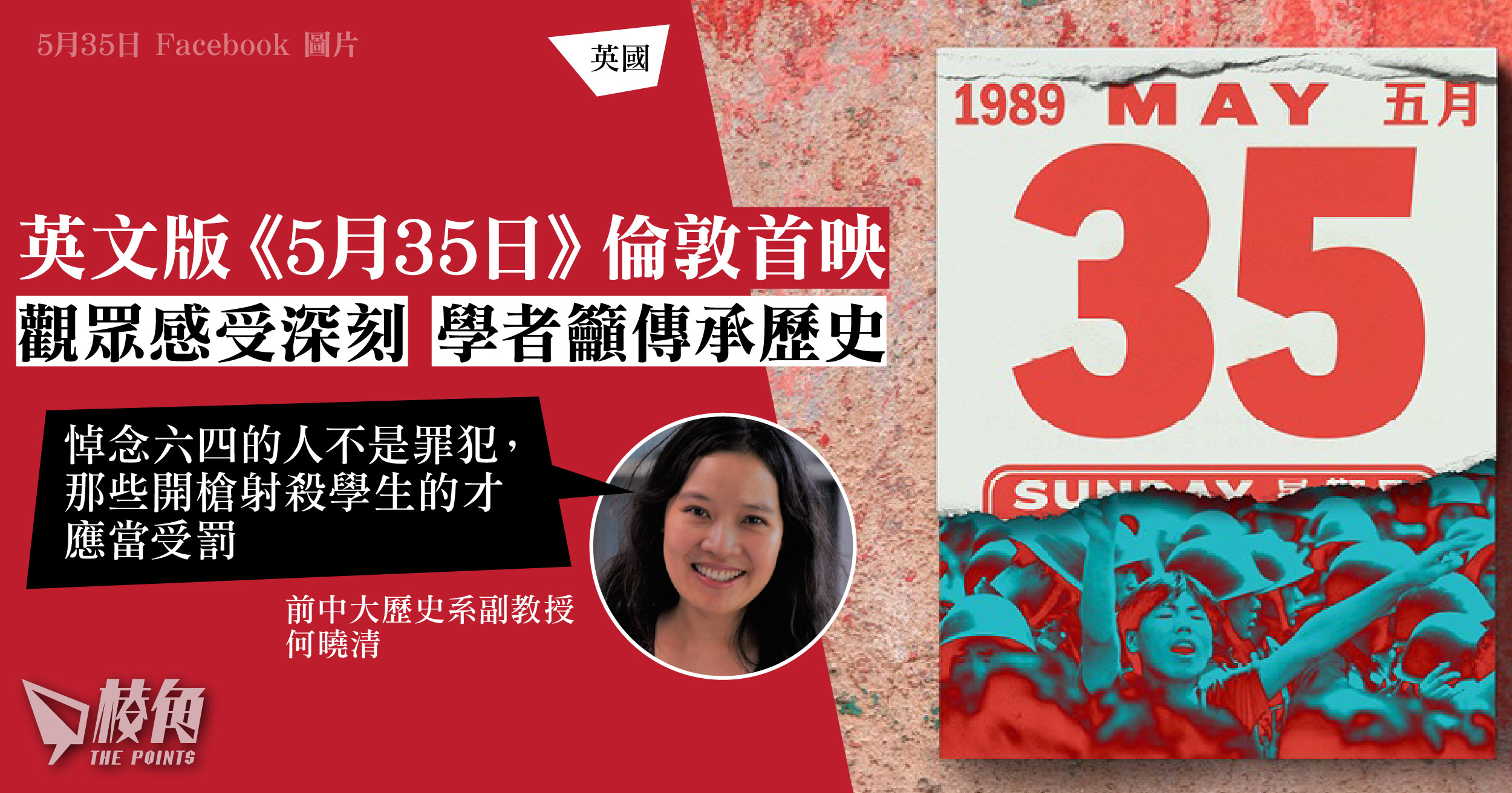 「六四舞台」劇目,英文版《5月35日》周三(29日)在倫敦開演,首場演出坐無虛席,當中不乏移英港人及本地觀眾。前香港中文大學歷史系副教授何曉清出席首映,場後簡單發言,呼籲年輕一代繼續為公義發聲。有港人觀眾向《棱角》表示,從未想過可在英國觀看有關六四的演出,形容心情感動。