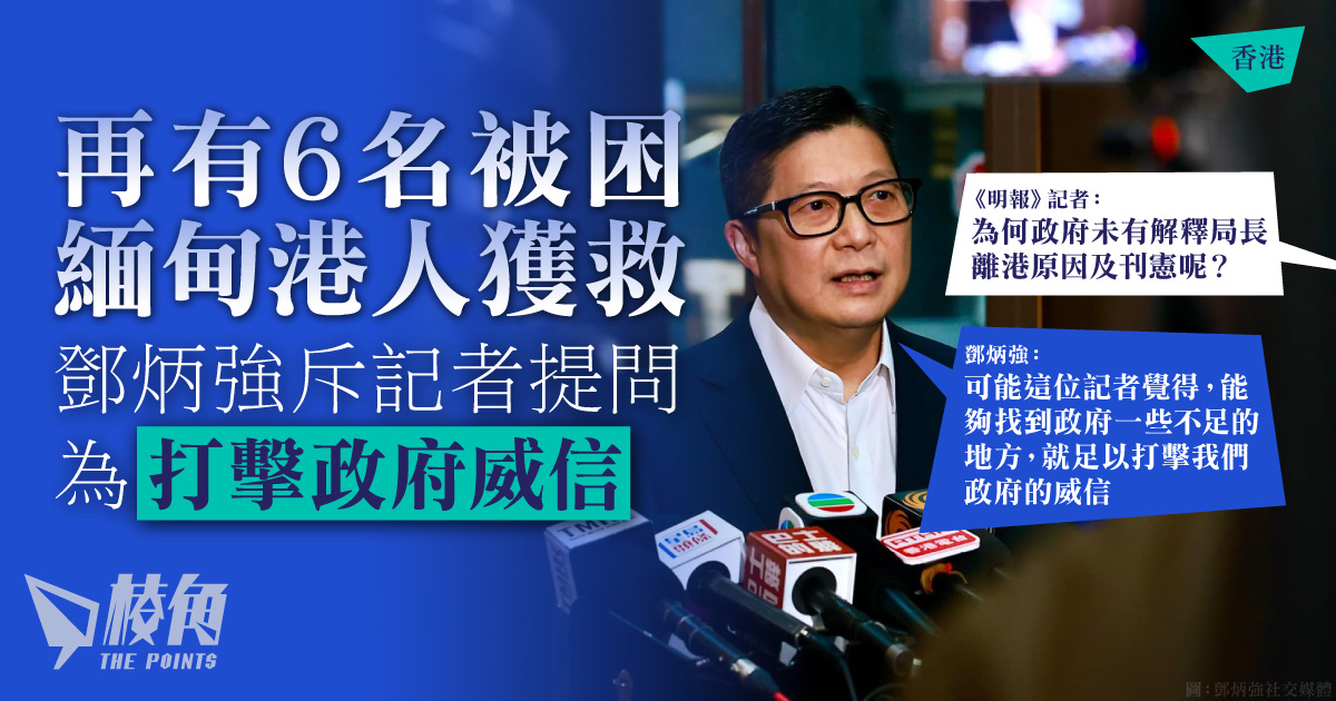保安局局長鄧炳強周五(7日)在機場表示,再有6名被困緬甸港人獲救返港。鄧炳強周四(6日)以公務為由臨時缺席活動,引起揣測。一名《明報》記者提問時指,為何周四政府未有解釋局長離港原因及刊憲,鄧炳強隨即「黑面」,一連串句子斥責記者借提問質疑政府做事,「可能這位記者覺得,能夠找到政府一些不足的地方,就足以打擊我們政府的威信」。