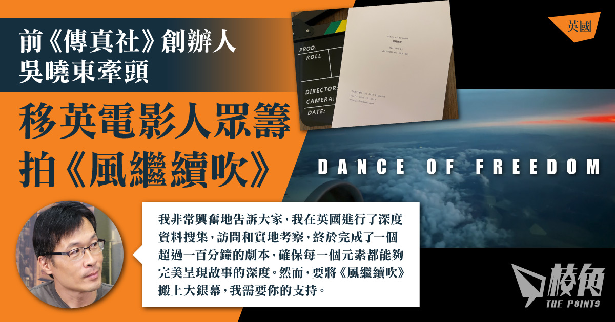 曾是有線電視資深記者、以眾籌的資金創立《傳真社》的吳曉東,年前移民英國,並且從新聞工作轉跑到,轉拍攝電影方向發展,並且已完成了6部短片,並曾奪得多個將項及提名。最近他為他的首部故事長片起眾籌,這部名為《風繼續吹》(Dance of Freedom)的一百分鐘劇本,是他經過深度資料搜集,訪問和實地考察而,以確保每一個元素都能夠完美呈現故事的深度。
