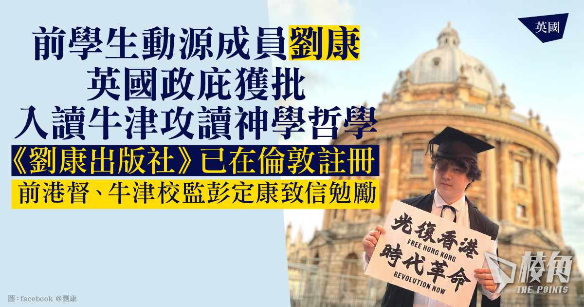 因涉嫌違反《國安法》被港府通緝,2020年流亡英國的前「學生動源」成員劉康,早前表示自己已獲牛津大學取錄。由其創立的《劉康出版社》表示,劉康獲獎學金入讀牛津攻讀神學及哲學,並以「香港效益主義黨」主席身份,獲英國政府批出政治庇護。最後一任港督、兼牛津大學校監彭定康勳爵致函劉康,希望他享受在牛津的生活, 並祝願香港早日恢復法治與自由。