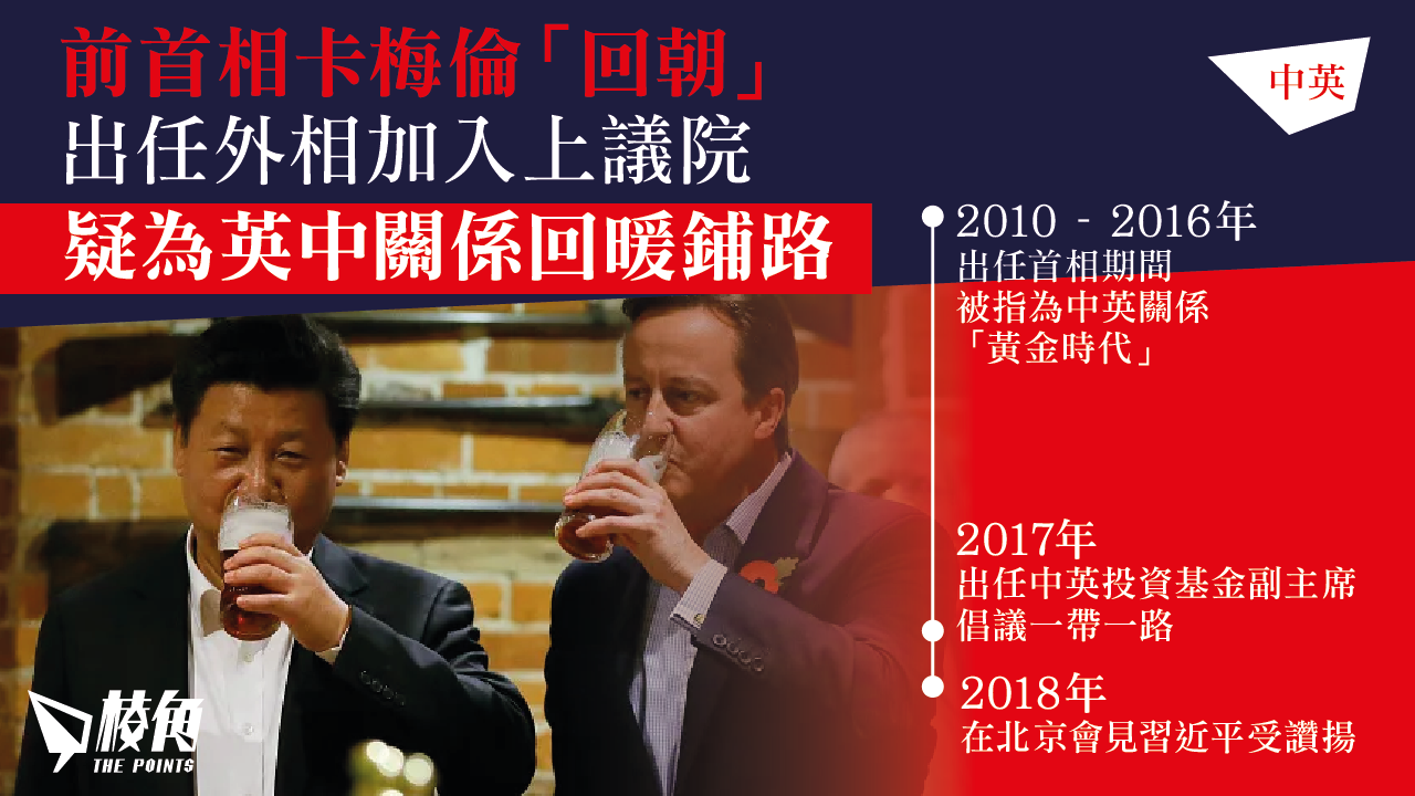 英國首相辛偉誠周一(13日)宣佈罷免內政大臣柏斐文(Suella Braverman),由外相祁湛明(James Cleverly)接任,懸空的外相一職由前首相卡梅倫出任,他同時於上議院佔一席位。卡梅倫出任首相期間,曾大力推動對華貿易,被稱為英中關係的「黃金時代」,卸任後亦繼續參予有關倡議「一帶一路」投資活動。有評論指,辛偉誠希望藉此挽回保守黨支持者的信心,加上辛偉誠對華態度越趨軟化,卡梅倫出任外相將為英中關係回暖鋪路。