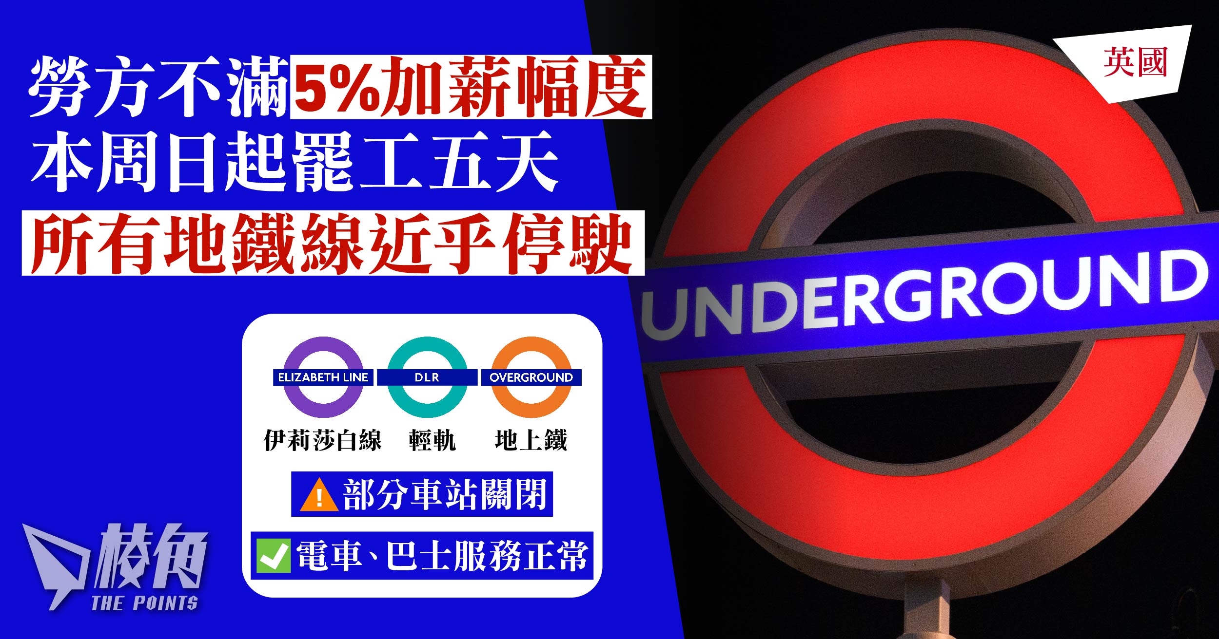 英國鐵路、海運及運輸工會(RMT,下稱工會)指責倫敦交通局(TfL)管理層壓榨薪酬,早前提出要求加薪,其後資方提出加薪5%方案。工會因不滿加幅難抵通脹,將於周日(7日)起一連5天,發起大規模罷工。