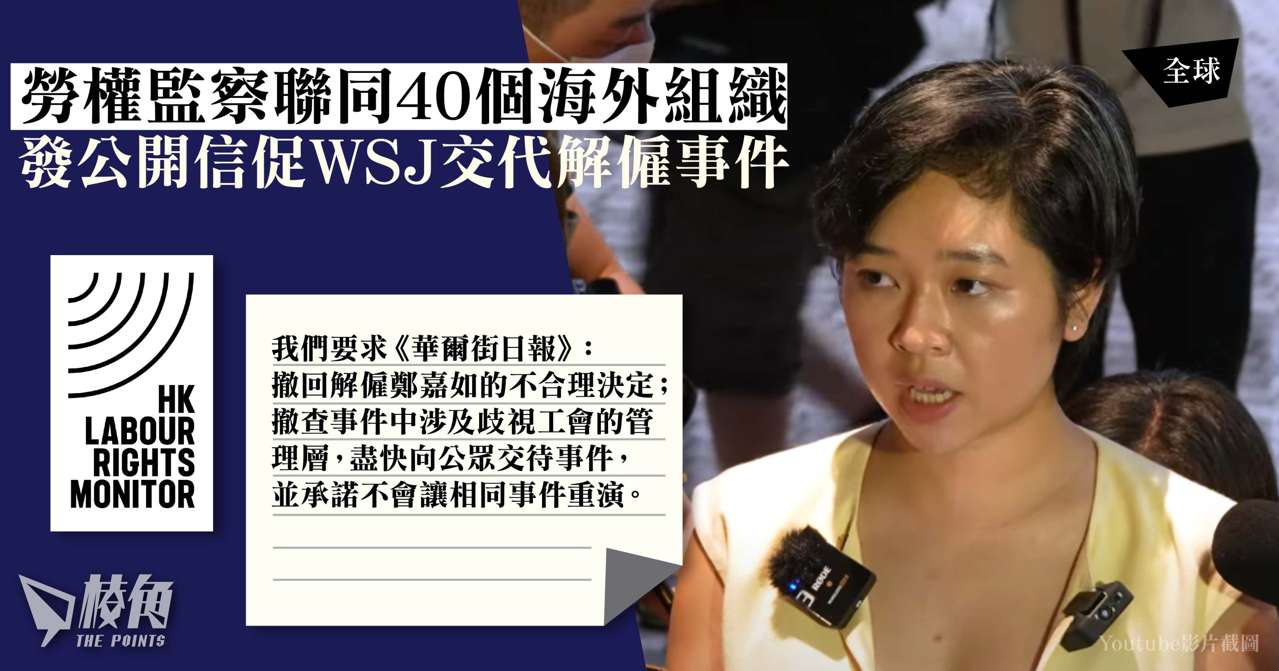 香港勞權監察在周四(7月18日)聯同40個海外港人公民團體和人權組織,包括香港監察、香港民主委員會、港加聯、台灣香港協會等等,向《華爾街日報》(WSJ)總編輯Emma Tucker發公開信,對香港記者協會主席鄭嘉如在周三(7月17日)被解僱表示震驚,要求該報撤回解僱的不合理決定,並撤查事件中涉及歧視工會的管理層,盡快公開交待事件,以及承諾不會讓相同事件重演。