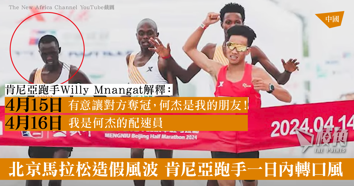 北京周日(14日)舉行半程馬拉松賽,馬拉松中國全國紀錄保持者何杰奪得男子組冠軍,但賽事末段被指疑似「造假」,3名原本領先的肯尼亞選手被質疑「護送」何杰到終點。其中一名肯尼亞選手賽後接受傳媒追訪,先指自己與何杰是朋友,承認有意讓對方奪冠;事隔一日,該名肯尼亞選手突然「改口」,指自己是何杰的配速員,但不知為何身上沒有識別。
