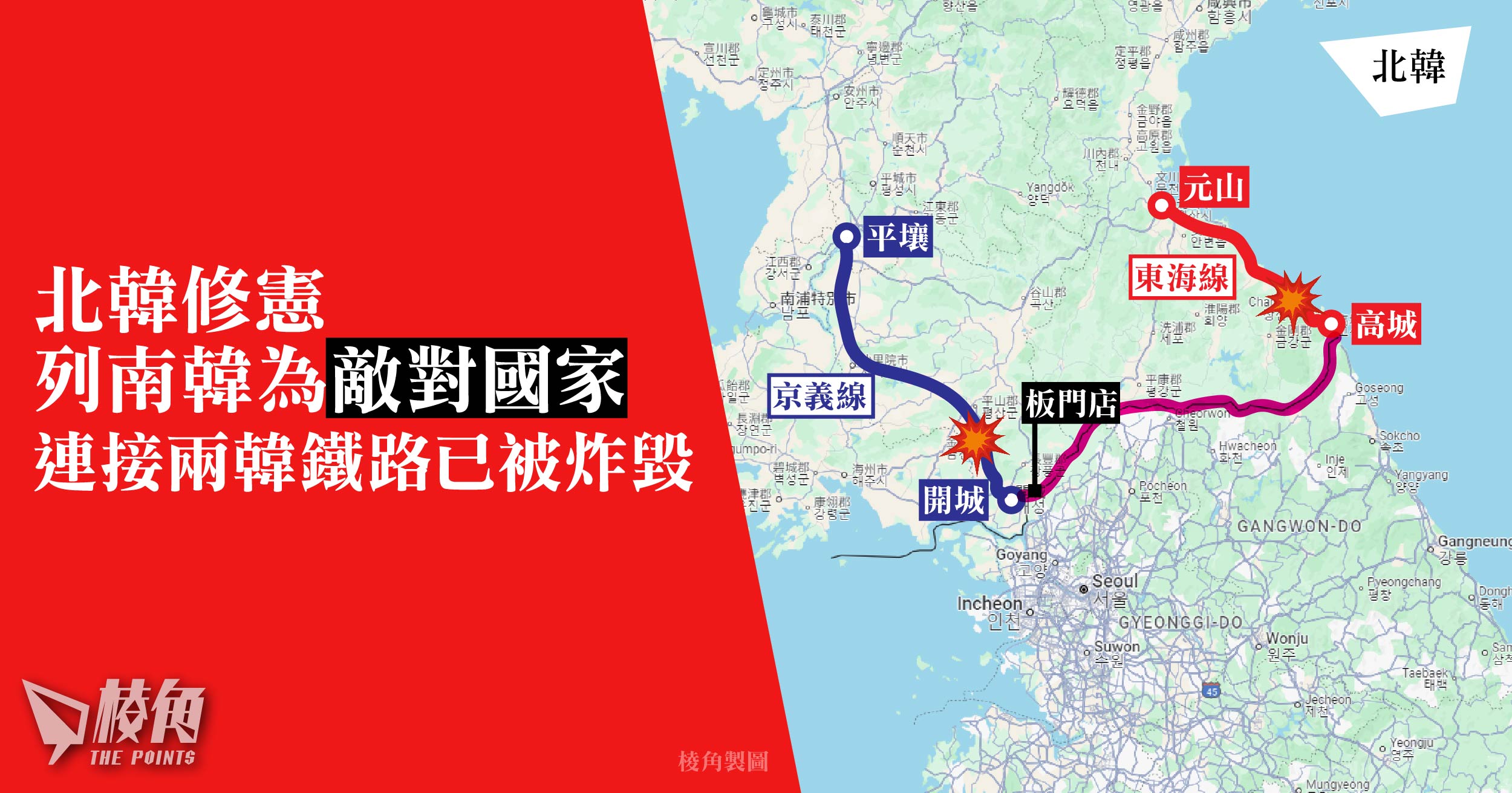 兩韓關係惡化,連接南、北韓的主要鐵路路段,據報周二(15日)已被炸毀。北韓官媒周四(17日)證實,當地最高人民會議依照領導人金正恩要求,已修憲將南韓列為「敵對國家」,並放棄以「兩韓統一」為國家目標,日前炸毀連接兩韓的路段,是為遵守憲法要求採取合理措拖。