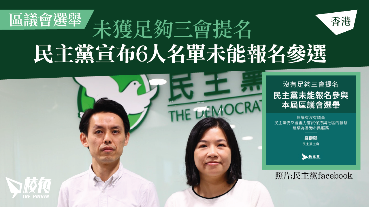區議會提名期周一(30日)結束,早前民主黨宣布由派8人改為6人參選區議會,多次向民政署力爭「三會」提名不果,民主黨今日宣布,由於成員名單均未獲足夠「三會」提名,未達參選最低門檻,因此未能參與區議會選舉。