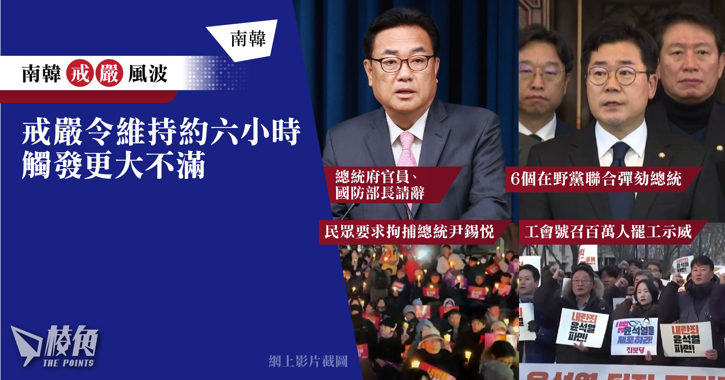 南韓總統尹錫悅周二(3日)晚頒布戒嚴令,最大在野黨緊急召集國會議員進行投票,結果一致贊成戒嚴令無效。尹錫悅在6小時後,宣布解除戒嚴令,事件震撼南韓及國際社會,後續效應仍持續發酵。多位總統府官員、國防部長先後請辭;當地最大工會號召百萬人罷工示威,直至總統下台;6個在野黨於周三(4日)就事件聯合彈劾尹錫悅,最快本周內有表決。