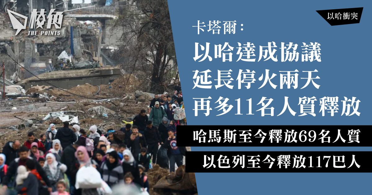 卡塔爾外交部發言人向外公佈,以色列及哈馬斯達成協議,停火將延長兩天,哈馬斯釋放再多11名人質,並在周一晚已返回以色列。