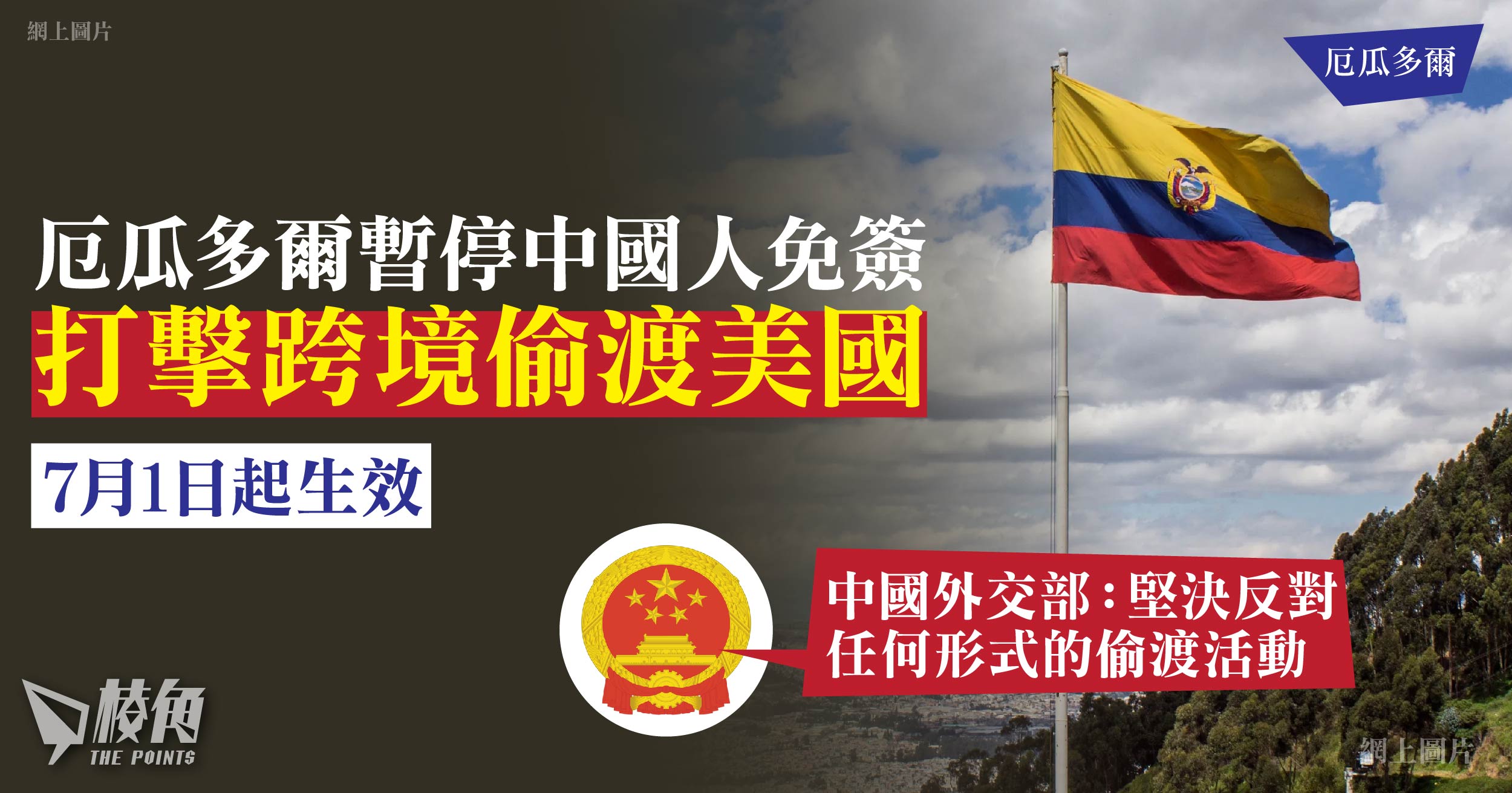 據《路透社》報道,厄瓜多爾外交部周二(18日)宣布暫停中國公民的免簽證入境待遇,改為入境前必須申請簽證,今年7月1日生效。厄瓜多爾外交部表示,近月發現有一半中國公民,未有通過正常途徑離開,該措施是為打擊中國人以當地作為跳板,非法入境美國或其他國家。中國外交部發言人林劍回應事件指,中方堅決反對任何形式的偷渡活動,正與相關國家聯合打擊跨境偷渡活動。