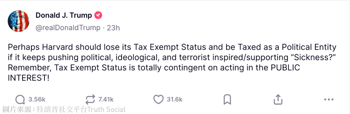 特朗普透過社交平台Truth Social發文威脅:「或許哈佛應被剝奪免稅資格⋯⋯免稅資格的存在完全取決於是否符合公共利益,哈佛若繼續推動政治、意識形態和恐怖主義相關的『病態』,應該接受稅賦懲罰。」