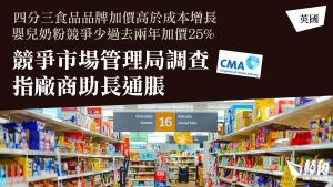 英國市場監管機構競爭與市場管理局(Competition and Markets Authority,CMA)的一項調查發現,過去兩年來,有四分之三的主要食品品牌加價幅度超過成本增長。其中,嬰兒奶粉因為競爭較少,過去兩年加價達25%。局方指廠商透過加價超越成本增幅的手法來擴大每件商品的利潤,但同時刺激了通脹增長。
