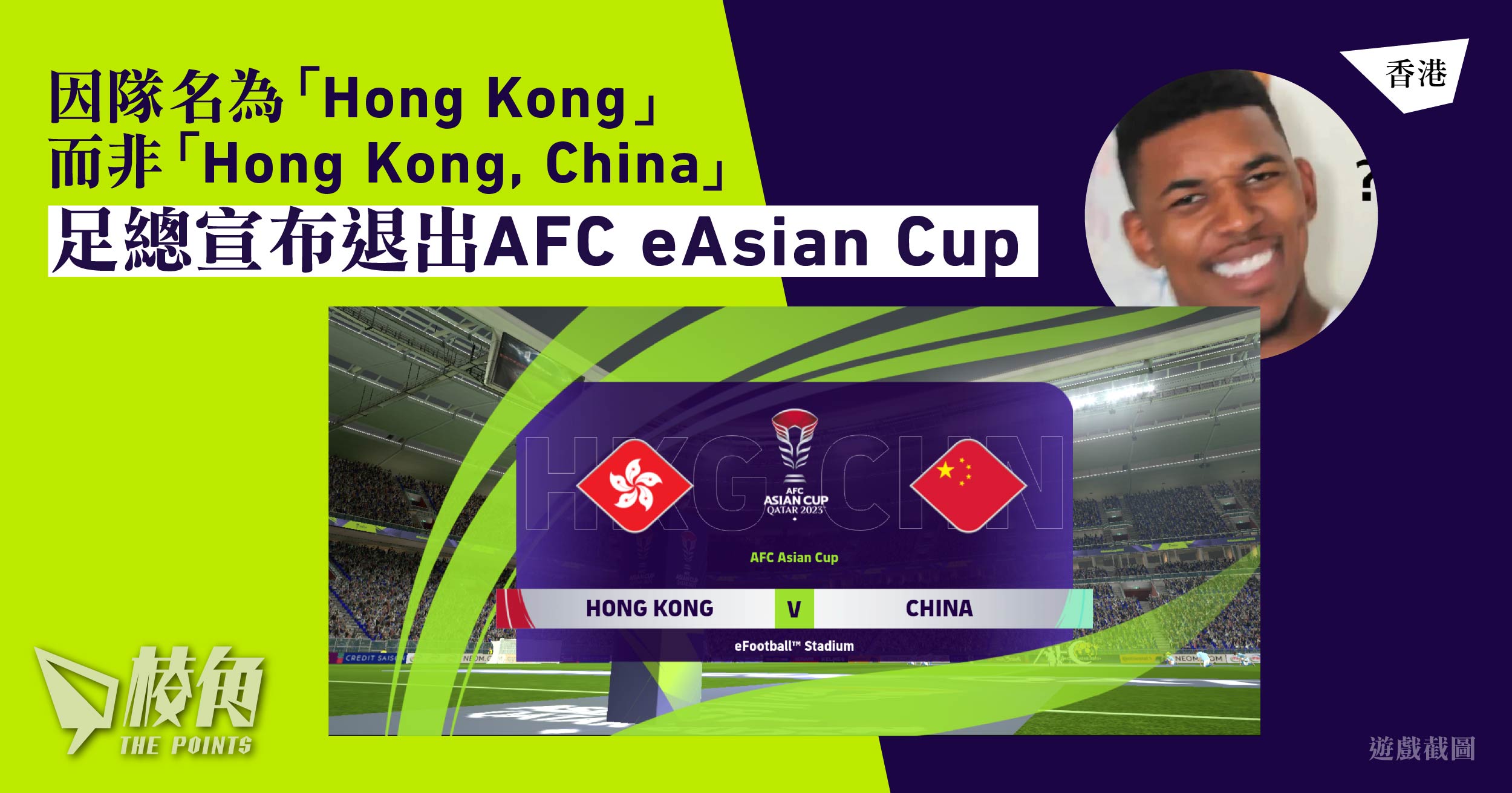 電競版亞洲盃「AFC eAsian Cup 2023」香港對阿聯酋(UAE)的賽事,原定在周四(2月1日)在卡塔爾多哈展開。但中國香港足球總會在開賽前突然宣布退賽,原因是該會「於1月29日發現 AFC eAsian Cup 2023 採用的 Konami’s eFootball 2024 遊戲程式未能正確顯示『Hong Kong, China』參賽隊名」,足總表示,已經連日與主辦方交涉,但仍未能妥善解決,所以按中國香港體育協會暨奧林匹克委員會的指引和建議,通知亞洲足協退出賽事。