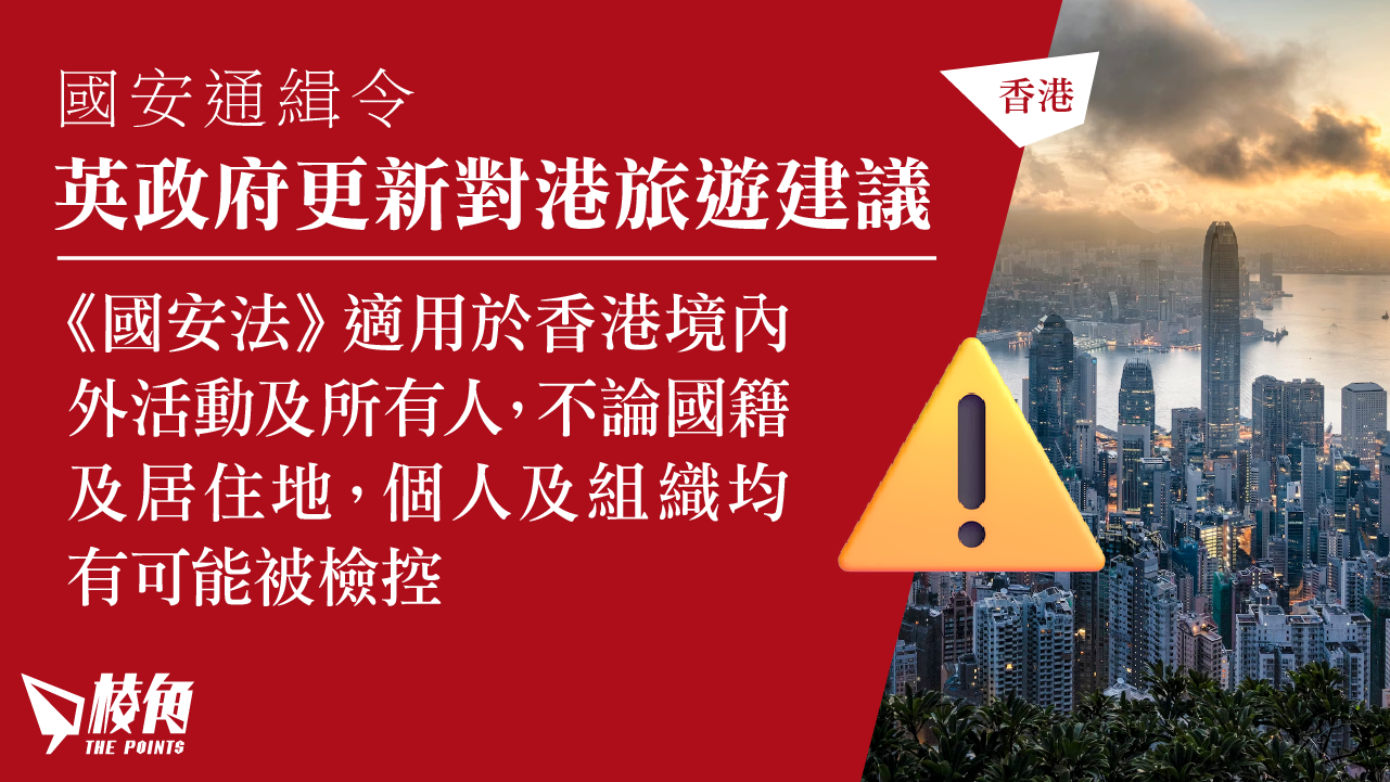 英國政府官網指,香港國安處已發出通緝令,並懸紅拘捕居住在香港以外的人,當中包括現居英國的人。新版建議強調《國安法》具境外法律效力,稱「國安法適用於所有香港境內外的活動,包括英國境內。不論任何國籍和居住地,國安法一律適用所有人。」提醒任何支持涉違反《國安法》人士的有關批評港府或中國的政治活動及言論,同樣有可能面臨檢控。